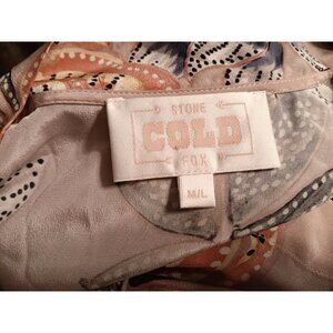 Indulge in elegance with the Stone Cold Fox Besos Short Robe. Made from 100% silk, this light pink robe features a beautiful floral design, perfect for luxurious lounging or a special gift. It does NOT have the waist tie. It is a size M/L and measures 36" in length from the top of the shoulder to the bottom hem and 16" from pit to pit. It has long flare sleeves and a low v-neck. Please see all photographs as they are part of the description. Shipped with USPS Ground Mail.