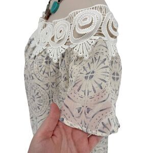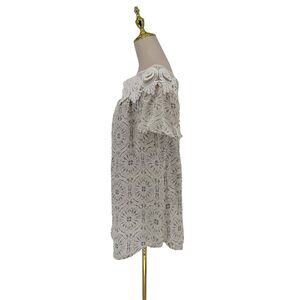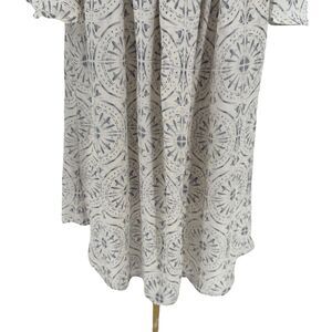 This mini dress is a tile/mosaic print of white and blue is super flowy. Eyelet at neckline and elastic at back keeps this piece is place. Super mini style, some may prefer to wear as tunic. Made in Los Angeles, made in the USA!