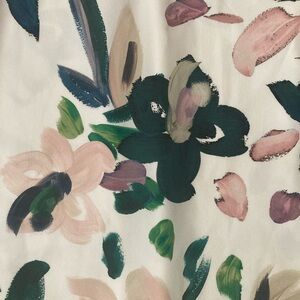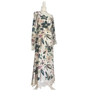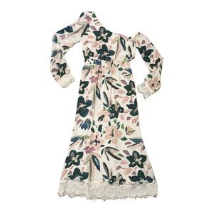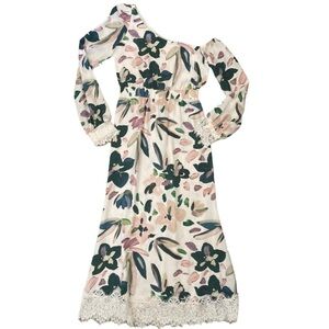 Stunning Stone Cold Fox Women's Maxi Vine Hopper Floral Crafted in 100% Silk with 100% Silk lining. Alluring Off one shoulder Silhouette Maxi dress with long sleeves embellished with exquisite lace trim. Hem also has beautiful lace detailing. This rare dress Features brushstroke florals in shades of Teal, pink, blue on a neutral background. A perfect occasion dress!