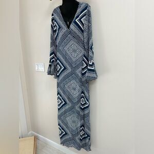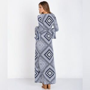 This stunning, floor length robe is crafted from 100% printed silk. A flared sleeve allows you to feel fabulous while wearing this.