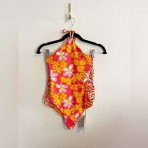 Cute Hawaiian print one piece with cut outs on side. New. Questions? Leave a comment below!
