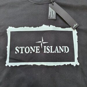 This black short-sleeve t-shirt features a white “STONE ISLAND” brand logo and the iconic compass logo on the front. Made of comfortable pure cotton.
