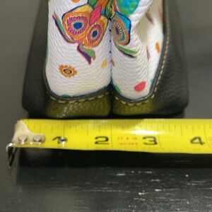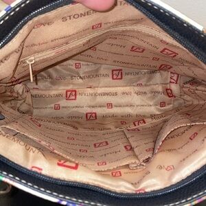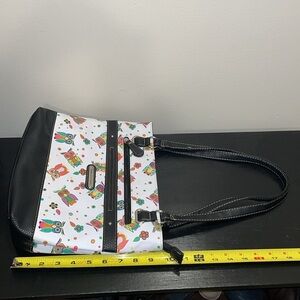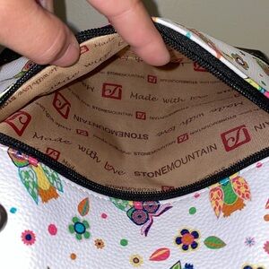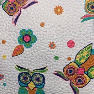 Charming tote with colorful owl design. Features sturdy black handles. Several zipper storage pouches inside and out with two open pouches inside for phone storage and other necessities. Perfect for everyday use.