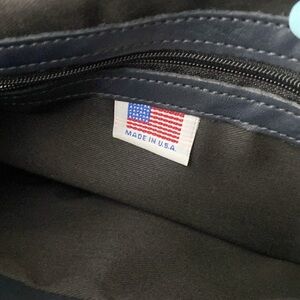 Stone Mountain Navy blue leather purse with long strap for shoulder or crossbody use. Roughly 12 inches wide by 7 inches tall (see photos). Has two zippered compartments and two non-zippered conpartments