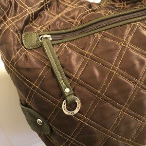 This bag has an olive green exterior color in a quilted pattern and accented with a belt and buckles.