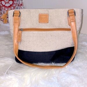 Stone Mountain Spectator Tote Bag. Canvas Color block. Top Zipper 2 Exterior Zip pockets plastic’s still on zippers Interior 2Slip and 1Zipper pocket Signature lining