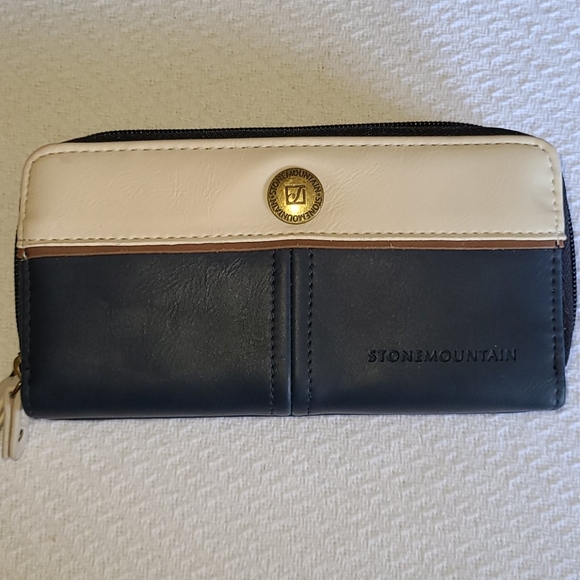 Stone Mountain Wallet. NWOT. Outside Zip Coin Pocket. 2 Zipper Compartments. One has a Removable Checkbook Cover with a Clear ID Pocket, 6 Credit Card ots and an ID Slot with 3 Full Width Pockets. The Second Side has an Accordion type opening with a zipper pocket and 8 Credit Card Slots and 2 Full Width Pockets. Genuine Stone Mountain Leather. Smoke Free Home.
