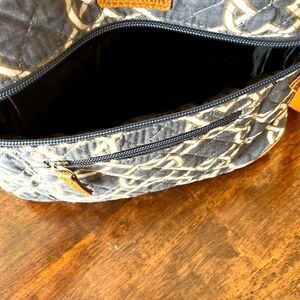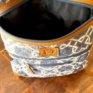 Faux brown leather accents including crossbody strap