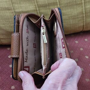 Stone Mountain's stylish black and brown wallet has a snap closure, seven spots for credit cards ,space for bills, place for coins and within that another zippered closure and the bigger one has a zippered closure, clear spot on the back for a license,and ring for keys.