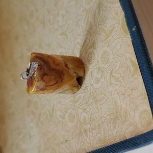 Small stone pendant in the shape of a half cylinder. The pendant is less than 1 inch long. It may be vintage; I am not sure of its exact age.