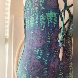 beautiful lace up Stone Row Swimsuit. Purchased at a swim boutique on Kauai- I appreciate the long tie that can be looped under the shoulders and tied behind neck on rough waves. Light use- light wear consitant with usage.