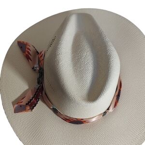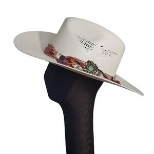 Stone White Straw Western Hat Navajo Orange Turquoise Band with Turquoise brooch
