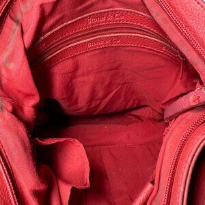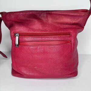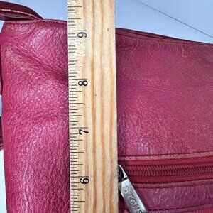 This Stone Mountain crossbody bag is crafted from red leather, offering a blend of style and functionality. It features an adjustable strap and a convenient front zipper pocket, making it a versatile accessory for everyday use.