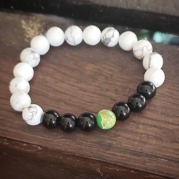 White howlite, black onyx, and green stone! Comes with black lave diffuser bracelet.