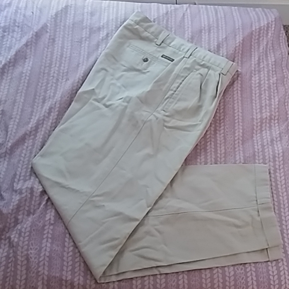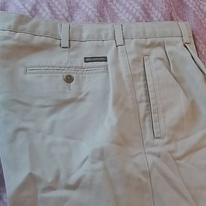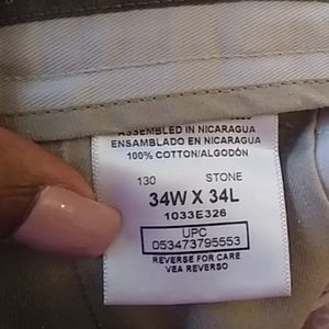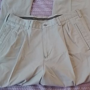 Stone colored front pleat cuffed khakis with two button closure back pockets. Size 34W 34L.
