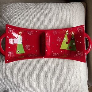Beautiful red ceramic Christmas platter decorated with trees and stars all over it. There are a couple of flaws on the a k, which is shown in the photo, but excellent overall condition. Approximate measurements shown in photos.