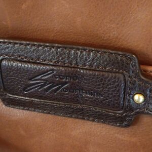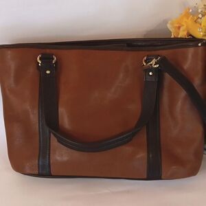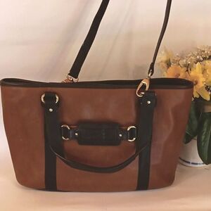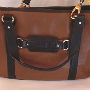 Change to shoulder bag with the long snap staps included with this bag.Luggage tan and black are a timeless combination. Feet on bottom. Inside: center zip, side zip, two slip pockets, key clip, magnetic closure.14 wide. 5 deep, 9.5 high. 7 or 19 inch drops from handles. Like NEW.