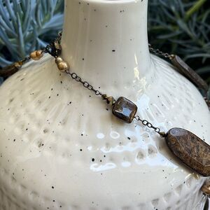 This is an absolutely gorgeous necklace, a variety of different sized brown quartz stones, on a dark metal chain adorned with soft gold faux pearls and a single pendant. Hook closure !