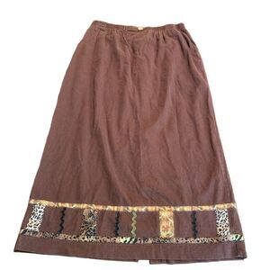 Stonebridge Brown Linen MIDI Skirt Ric Rac Animal Print Teacher XL Elastic waist. Pockets. Great preowned condition linen rayon blend. Approximate length 33 1/2