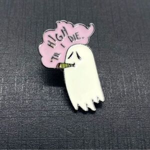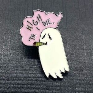Funny Halloween Cute Ghost Enamel Metal Pin “High Till I Die”. New. Approximately 1 1/4” tall, 3/4” wide.
