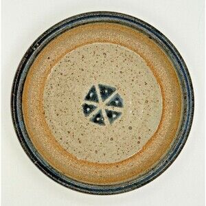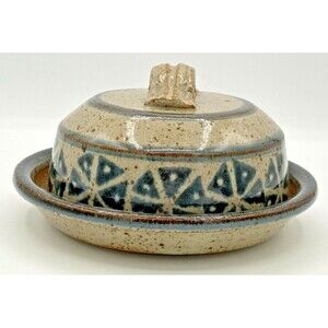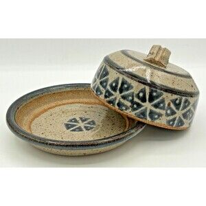 Condition: Brand new no box. Art pottery, beautiful speckled glaze with blue trim and a triangular flower pattern around the cover. Unmarked. Measures about 6.25" in diameter by 4" in height. No chips, cracks, stains or crazing. Please see all pictures for condition. Hand wash only.