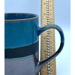 Preowned Stoneware Blue Metallic Bronze 3 Toned Coffee Tea Mug Artisan Drip Glaze. Holds 16 ounces and stands 4 1/4 inches. Some signs of ware on the bottom.