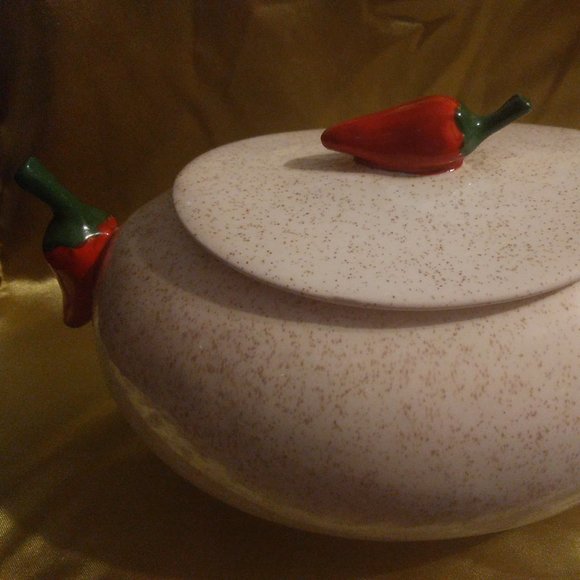 Beautiful stoneware pristine condition with no cracks the serving dish has a southwestern look. The lid has a red chili 🌶 and two red 🌶 on the two sides of the serving dish.