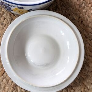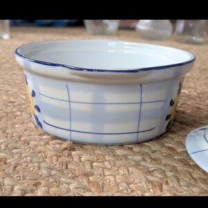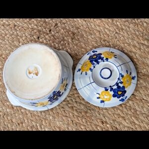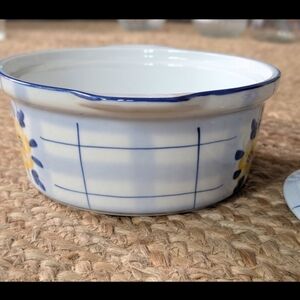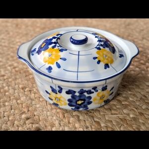 Lidded casserole dish. Stoneware. Floral pattern. Blue, white and yellow multicolor. Overall good used condition. No chips or cracks. Item comes from a clean, smoke free home. Message with any questions.