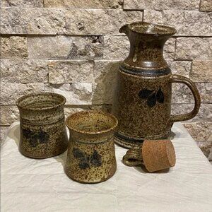 • Condition: Small nicks near the lip of the jug (age-appropriate); cups are slightly different sizes due to handmade construction, minor signs of age.