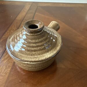 This stoneware pottery dish is a vintage piece of art pottery handcrafted in the United States. It features a round shape with a glossy brown finish and a single compartment covered by a lid. (43)