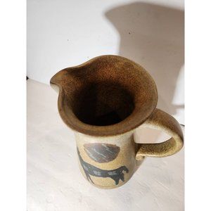 This listing is for a beautiful stoneware pitcher with a primitive depiction of a bull under a sun/moon. Handle and spout for easy pouting. This piece is heavily and if you are the buyer, be assured it will be packed and shipped with care.