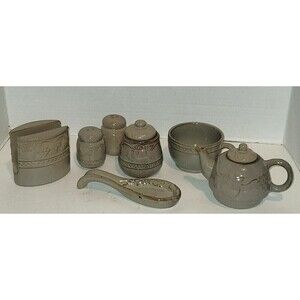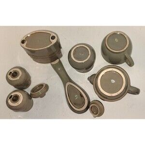 This is a beautiful dove grey with jade undertones set. It is a 7 or 9 pieces (depending on whether you count the lids or not) tea for one set. The pieces include: