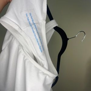 Elegant white one-piece swimsuit. Features subtle pink button accents. Perfect for a stylish beach day.