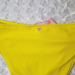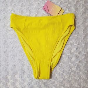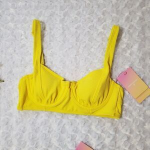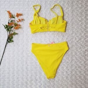 Bright yellow bikini set. Features a structured top and high-waisted bottoms. Perfect for summer.