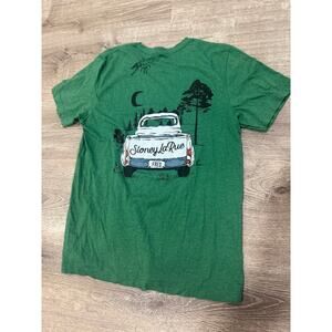 The Stoney La Rue Band T-Shirt is a women's size M green shirt featuring a graphic of a classic American truck. This short sleeve, crew neck tee is made from a comfortable cotton blend material, perfect for casual wear. The regular fit and basic style make it a versatile addition to any wardrobe, ideal for fans of both the band and Americana culture. This autographed shirt is a unique and stylish piece for any music lover.