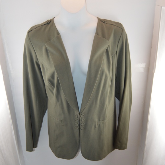 NWT Stoosh Military Inspired Army Olive Green Long Sleeve Blazer Jacket. Decorative button shoulder detail with pointed label that starts at chest level. Hook closure with 8 decorative buttons and faux front pockets. Lightweight and stretchy. Perfect for work or to go out. Plus Size 3X. 62% Polyester, 33% Rayon, 5% Spandex. Style #15093W6781SP