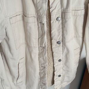 Off-white jacket with warm sherpa lining. Button closure and front pockets.
