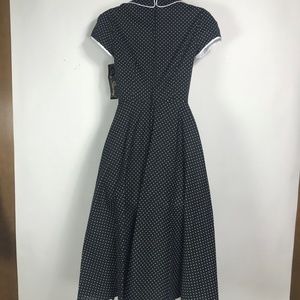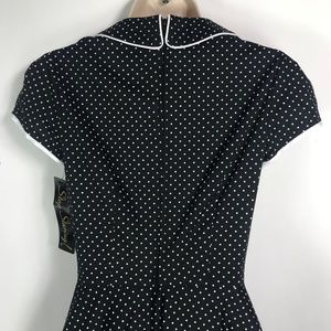 Chic black dress with white polka dots. Features a classic collar and button details. Short sleeves add elegance.