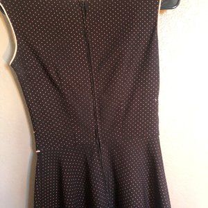 This is a great summer dress! Black background with pink polka dots, cap sleeves, waist and neck have pink trim. Full circle skirt with tight bodice.