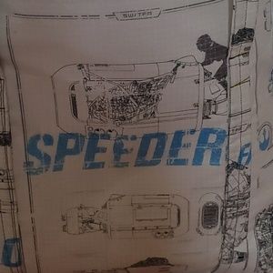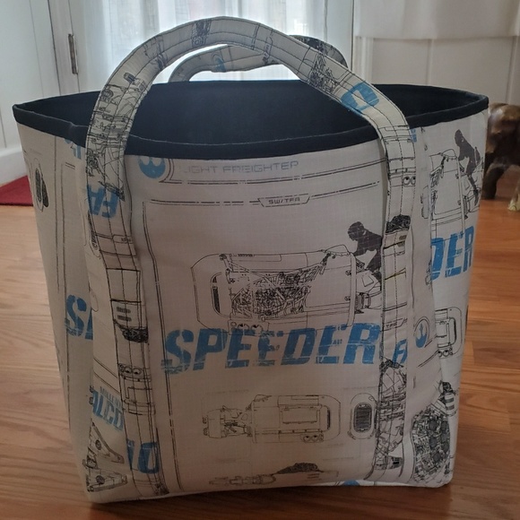100% Cotton Fabric (Speeder). Black lining for the interior. Heavy Pellon Interfacing. Straps were made for easier carrying.