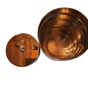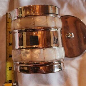 This handcrafted jar combines mother-of-pearl accents with a polished metal finish, offering a stylish and durable storage solution for small items.