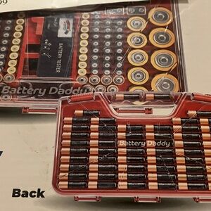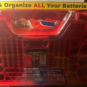 Organize all your batteries with the Storage System. This sleek and compact red organizer holds up to 180 batteries, keeping them neatly stored and easily accessible.