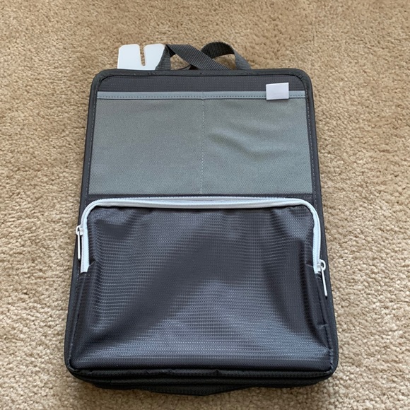 Storage bag, hard sided. Has plastic tan to pull out content. Lots of side pockets. Would be good for tablet and accessories. New no tags