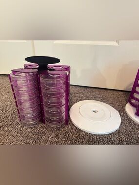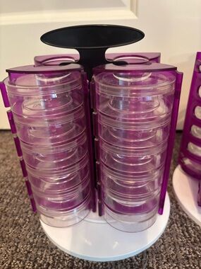 2 spinning carousels with 24 containers each. 1 of the carousels is not attached but it still sits nicely on the base and does spin.