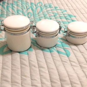 White ceramic storage jars, set of three small medium and large. The small is inches 2 tall, the medium is 2-1/2 inches tall and large is 3-1/2 inches tall they all have same diameter Of 3 inches. They all have closing mechanism and lids. In perfect condition no chips no cracks.