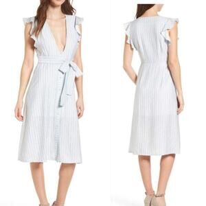 Storee Blue White Stripe Button Front Tie Waist Plunging Midi Flutter Dress S