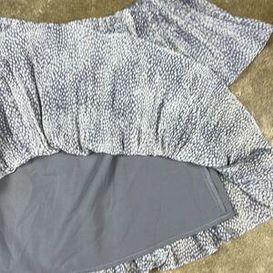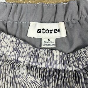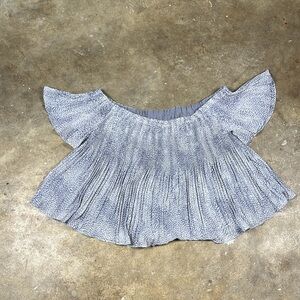 Storee Off shoulder accordion top in a grayish blue and white pattern with lining