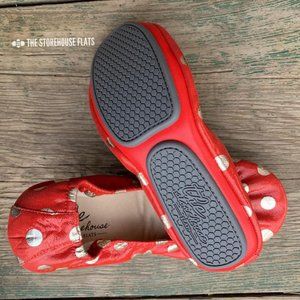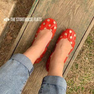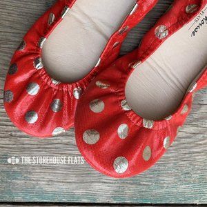 A super cute red leather shoe with crackled gold foil dots. If you have a vacation planned to a special place this coming year, you want these shoes! Incredible <3 leather <3 foldable <3 Storehouse flats that make your feet feel amazing <3