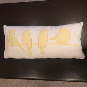 Storehouse shabby chic bird graphic accent pillow. In very good used condition. Tan burlap type background, w/yellow bird graphic & embroidery. Reverse side is plain. Small blemishes on backside - see pics. Bottom zip to remove pillow. Pillow filling is feathers & some pillows have come out of the (inside) pillowcase - see pic. Measurements approximate. 26 1/2 in x 11 1/2 in x 6 in. Color not quite as dark as shown. 0102