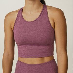 Elevate your activewear with this Stori Activewear Racerback Sports Bra in a beautiful heathered purple shade. Made from a soft, seamless stretch fabric, this bra offers a smooth, second-skin feel with just the right amount of compression for medium support. The racerback design allows for full range of motion, while the wide band and scoop neckline provide comfort and coverage during any workout.